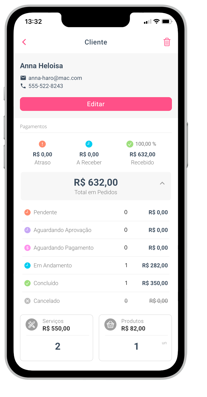 Acompanhe facilmente pedidos por status, pagamentos e despesas por categorias